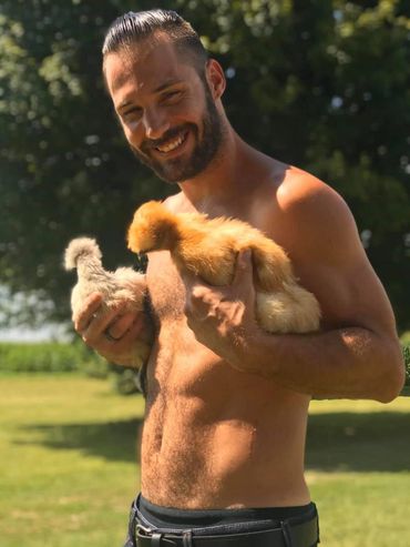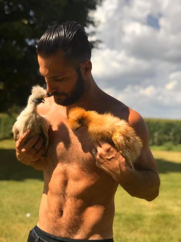 Jeremy's wife Rachel posted these hunky photos of her husband, and the couple's silkie chickens. The comment section went all "chickens gone wild". I thought it was hysterical and I made a joke about a chicken hunks calendar, and then went to bed. To my surprise the idea spread like wildfire and everyone was talking about getting a calendar together in both the silkie chickens group and the victory gardens revival group by morning! We all think its a great way to call attention to the need for the anti chicken ownership laws to change. Soon enough everyone's husbands began being posted with captions like "Here is Mr. February!" Then the chickens chums page began!